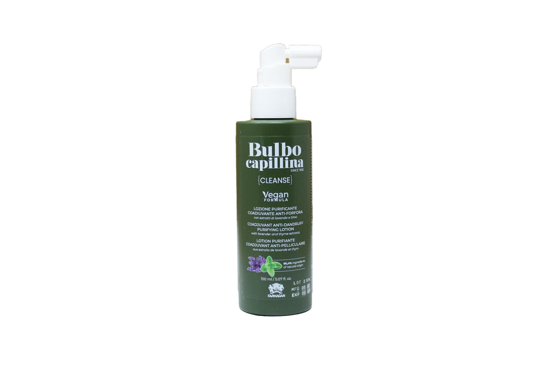 Farmagan Bulbo Capillina Formula Vegan Cleanse Lozione Purificante è un trattamento coadiuvante anti forfora formulato per riequilibrare e purificare il cuoio capelluto. Grazie alla presenza di ingredienti attivi di origine naturale e alla formula vegana priva di siliconi e parabeni, elimina la forfora visibile e previene la sua ricomparsa, lasciando una piacevole sensazione di freschezza.